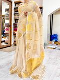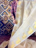 Elevate your special moments with our stunning handloom Kerala tissue saree, featuring majestic ducks woven with pure golden threads. The body boasts vertical golden stripes, complemented by striped golden patterns and grand duck motifs on both sides. Crafted from luxurious tissue fabric, this saree is perfect for weddings and grand events. Make your big day unforgettable – drape this masterpiece and shine.