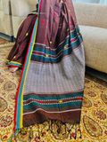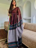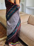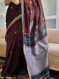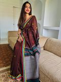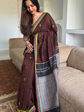 - Design: Deep earthly brown base with a vibrant multicoloured border; richly embroidered pallu with a luxurious fall