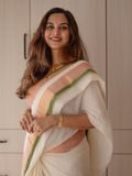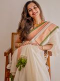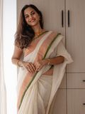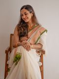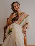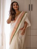 Understated tradition, reimagined. This 6.5-meter Chandrika mul cotton saree in a soft ivory base glows with the quiet elegance of a moonlit Onam night. A slender silver-green border adds just the right hint of contrast—subtle, never loud.