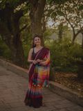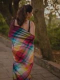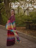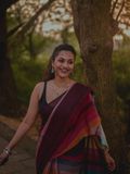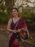 One of our best sellers and a viral favourite on our page, this handloom cotton saree is loved for its effortless charm and timeless appeal. Set on a rich maroon base, the saree features multicolour stripes running through the body, adding vibrance while keeping it elegant and wearable.