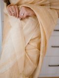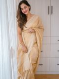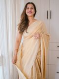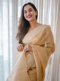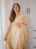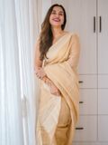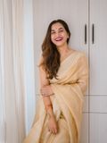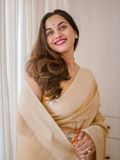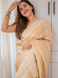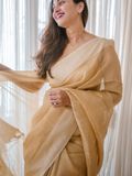 Elevate your wardrobe with this exquisite Linen Silk Saree, crafted from premium linen silk for a soft, graceful drape. The saree is adorned with subtle golden stripes woven throughout, adding a touch of shimmer and sophistication to its elegant texture.