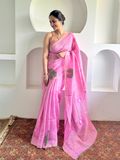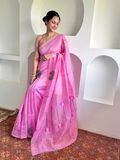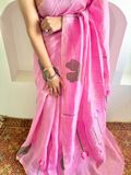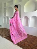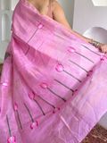 A regal muslin–linen–silk blend with a soft sheen and graceful fall. Intricately woven lotus motifs lend festive elegance, while the airy handfeel makes it effortless to drape for weddings, parties, and special occasions.