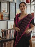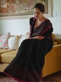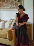 A celebration of subtle elegance, Tuhina B is crafted in breathable mul cotton, offering effortless comfort with a refined touch. The deep black drape is beautifully accented with delicate pink checks and a striking border, adding just the right pop of color. Finished with playful tassel detailing along the pallu, this saree blends simplicity with charm—perfect for everyday grace or understated occasions.