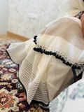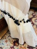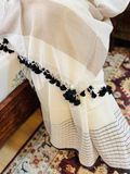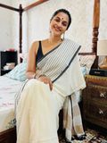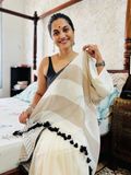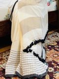 The pallu features graceful golden zari stripes, bringing warmth and depth to the monochrome palette. Finished with neatly detailed black tassels, this 6.5 meter saree balances softness with structure beautifully.