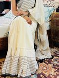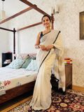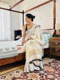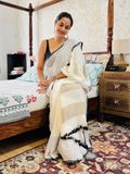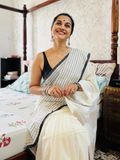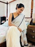 A celebration of subtle elegance, Tuhina is crafted in breathable mul cotton that drapes like a whisper against the skin. The pearl white body is woven with fine black checks, where select squares are delicately highlighted with zari, adding a quiet shimmer to its minimal aesthetic.