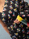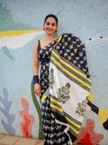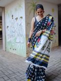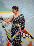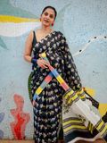 Step into a world of effortless charm with this black base cotton saree, adorned with delicate bird hand block prints scattered gracefully across the body. One side of the saree features a striking multi-colour border that adds a vibrant twist, while the white base pallu with intricate prints ties the look together in a playful yet elegant way.
