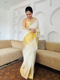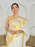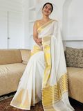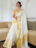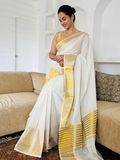 A timeless Kerala kasavu saree woven in soft cotton, celebrating the beauty of tradition. Designed with a striking temple border on one side and elegant golden zari stripes across the body, this saree carries the classic charm of Kerala’s festive heritage. The rich striped zari pallu completes the look, making it a graceful choice for Onam, Vishu, temple visits, and festive gatherings. A piece that keeps tradition alive while offering effortless elegance.