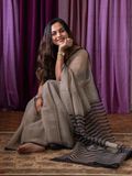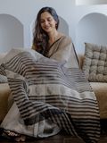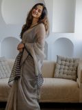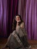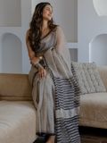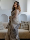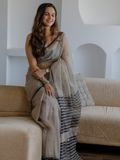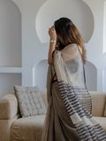 A soft dust-cream base adorned with delicate black zig-zag lines across the body, finished with a striking black floral border and a beautifully detailed pallu.